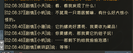 8、互动树枝后拿着做好的木剑回到寄居蟹位置对话小天,对话剧情结束后对话小帆,小帆表示小珊想要寄居蟹的螺壳,互动脚底下螺壳后对话小珊,将寄居蟹换下来的壳给她,三个小孩离开,对话寄居蟹,结束后完成奇遇。