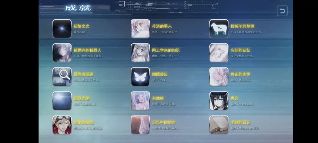 露西她所期待的一切成就共有15个,分别是初始之光、冷淡的男人、机械羊的梦境、被梦抛弃的机器人、网上学来的知识、忘却的记忆、冒险者玩家、蝴蝶效应、真正的永痕、超越光速、灰姑娘、再会、胡来的挑战、记忆中的地方、尘封的日记。具体的各个成就达成的方法途径内容见下文详情!